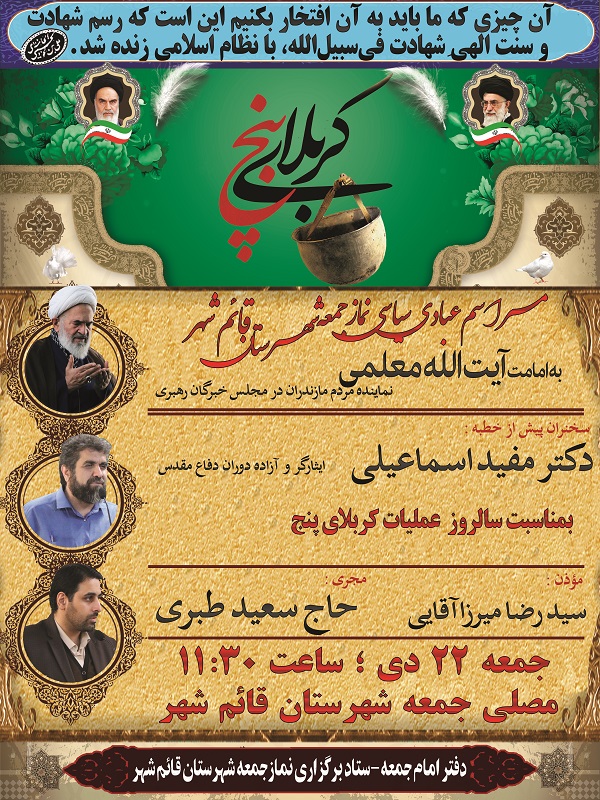 به اطلاع می رساند : گرامیداشت سالروز عملیات کربلای پنج با اجرای آقای مصطفی یوسف پور ، و سخنرانی جناب آقای دکتر مفید اسماعیلی«ایثارگر و آزاده دوران دفاع مقدس» رأس ساعت 11:30صبح جمعه 22 دی 1402 ، بهمراه مراسم نمازجمعه این هفته شهرستان قائم شهر به امامت آیت الله معلمی «عضو مجلس خبرگان رهبری و امام جمعه قائم شهر» ، همراه با ندای ملکوتی اذان با نوای جناب آقای سید رضا میرزاآقایی ، در مصلی جمعه قائم شهر، برگزار خواهد شد.