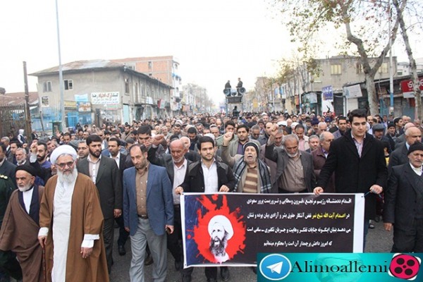 راهپيمايي آيت الله معلمي به معيت جمع کثير نمازگزاران جمعه قائم شهر در اعتراض به شهادت شيخ نمر توسط آل سعود