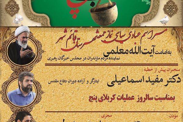 اطلاع رسانی برگزاری گرامیداشت سالروز عملیات کربلای پنج و مراسم نمازجمعه این هفته ( 22 دی 1402 ) شهرستان قائم شهر به امامت آیت الله معلمی
